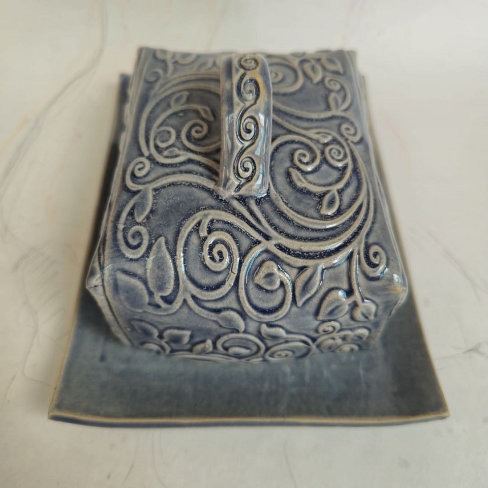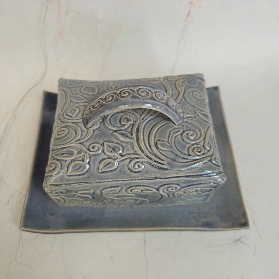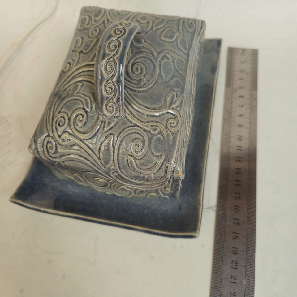 Handmade bluegrey stoneware butterdish.  Quirky slab built. Dishwasher safe.