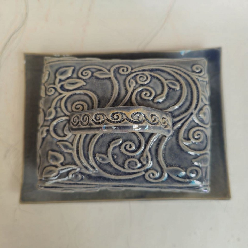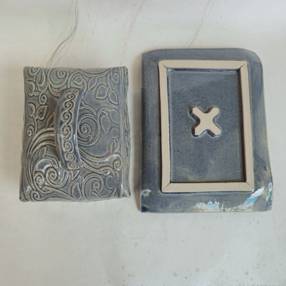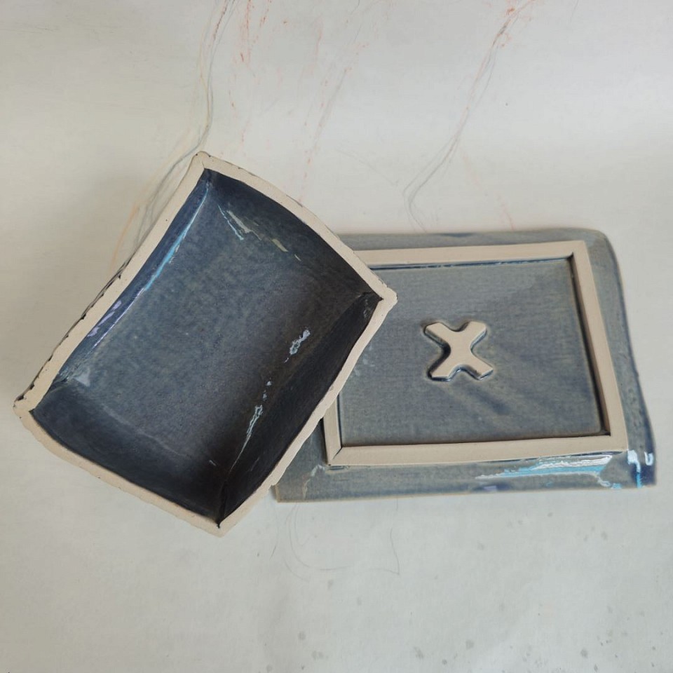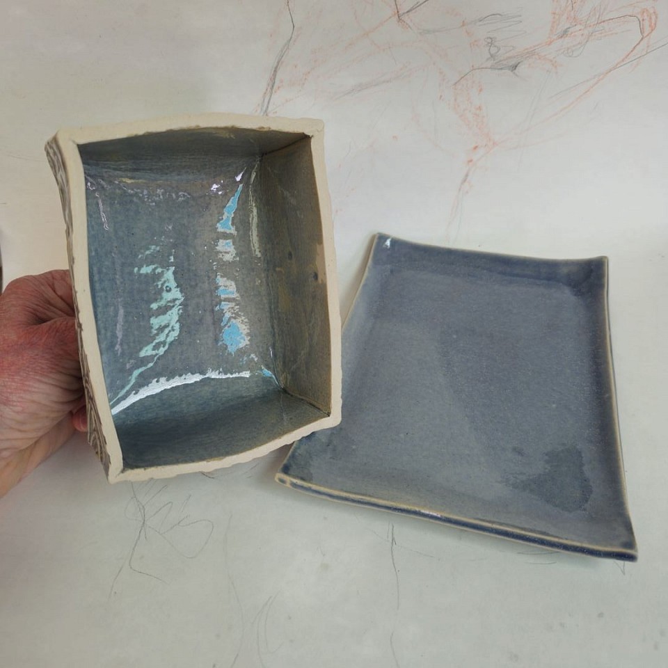 Handmade bluegrey stoneware butterdish.  Quirky slab built. Dishwasher safe.